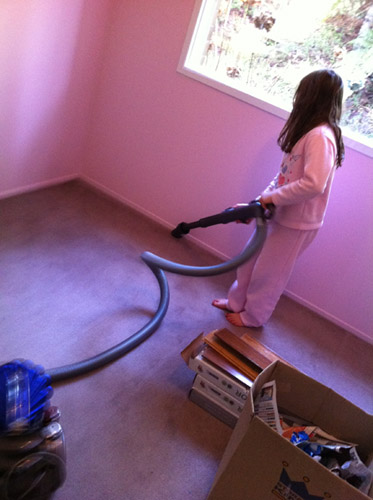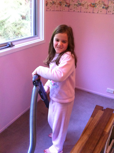 She happily vacuumed the carpet in her room the other day before Greg pulled up the carpet to make way for floating floorboards (you can see a sneak peak in the second photo). Â The funniest part was Greg had to ask her to stop, she was a girl on a mission. Â I think all up, she vacuumed for a good 15 minutes. Â I hope she always finds joy in vacuuming. Â Do your kids have a household chore that they love? Â Jacinta x