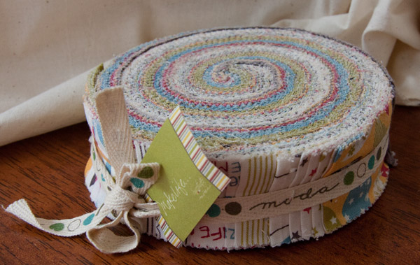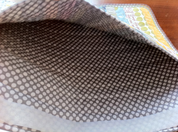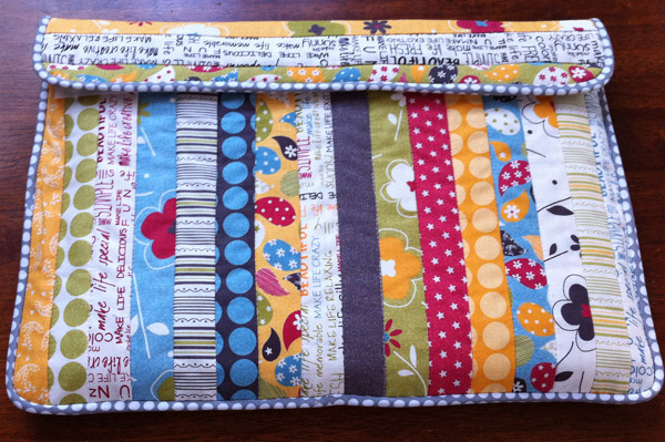 I made it out of a honey bun from Sweetwater’s Make Life fabric range. Â Oh, I do love me some pre-cuts. Â The grey and white spotted lining fabric I purchase at Spotlight. Â I’m really happy with how it has sewn up and hope I can avoid scratching my laptop any further. Â The cover also acts as a mat to sit under my laptop too.