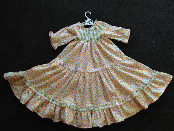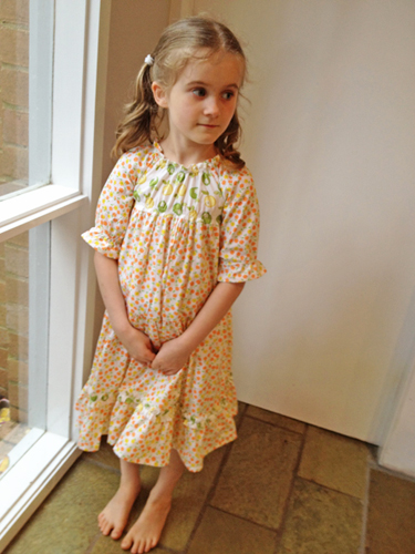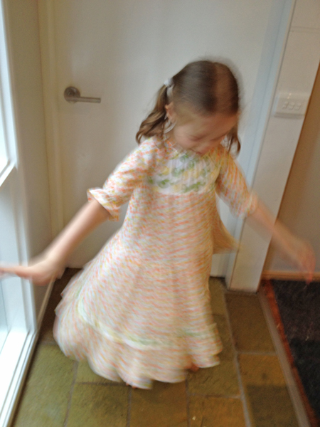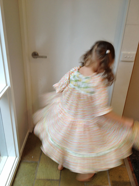 One of Tenneille’s birthday gifts was a dress I made for her. Â Now I must say this dress has a twirl factor of 10! Â It’s a fairly simple pattern and apart from some shirring issues, it made up very quickly. Â The pattern is called Molly Mae and is by Amy Hamberlin of Kati Cupcakes pattern co. Â This is the second pattern I have used by her. Â The first was Scarlett’s quilt. Â The sizing goes from 12 months through to 10 years. Â So I can foresee making quite a few of these. Â The pattern was originally purchased from The Fat Quarter online shop, but I don’t think they stock it now, however, it is available here. Â The fabric comes from my stash. Â I originally purchased it from Spotlight some years ago. Â Now to make one for Scarlett. Â I can just imagine all the twirling fun they are going to have together. Â Makes me want one too.