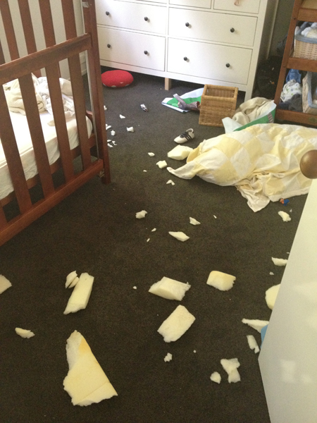 Care to guess what all that mess used to be? Â His change table mat! Â He’d certainly had a lovely time with it. Â It was even in his hair. Â Together we cleaned up the mess. Â Suffice to say, his nappy changes are not so comfy anymore! Â I am tempted to make him a tee-shirt with the words ‘Mischief Managed’. Â I think that would be rather fitting. Â Jacinta x
