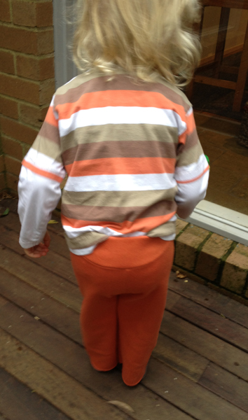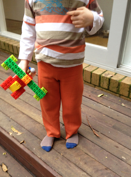I spent just one hour today sewing, and actually finished what I started (shocked, I know!). Â I made the Oliver + S Nature Walk pants. Â What a lovely simple pattern. Â The instructions are very clear and there isn’t much to making them up. Â This is an older pattern, so not sure if it is still available. Â The sizing goes from 6 months to 4 years. Â I made size 3. Â They are fairly slim fitting, so those who use cloth nappies/diapers on their little ones may have a little trouble fitting in the tooshie department, other than that, no complaints about the pattern. Â I didn’t hem them, as they were the perfect length. Â I used cotton/polyester fleece, same stuff tracksuits are made from, which has a nice stretch, so should be nice and cosy for Jairah. Â He seems to be going through multiple clothes during the day, due to lots of lovely mud, so they will get plenty of wear. Â In fact, I think I might even make him another pair. Â I would like some in my size, they would be great for yoga.