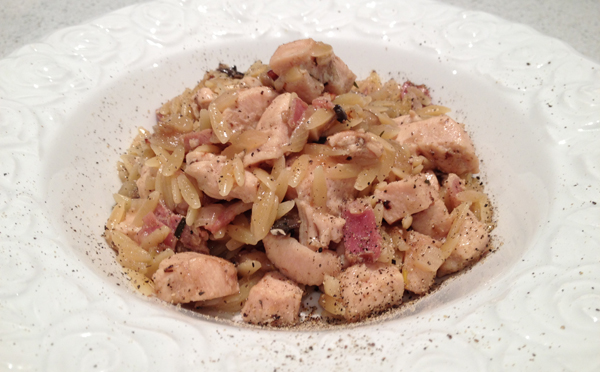 I’m all for quick and easy weekday meals. Â Especially when I know all the family will eat it without complaint. Â Risoni (rice shaped pasta) cooks quickly and this meal only takes about 15 minutes cooking time and it only uses one pot, so not too many dishes! Â I add a small dash of cream to the kids servings. Â I love pepper on mine. Â Parmesan cheese would go well with this dish too.
