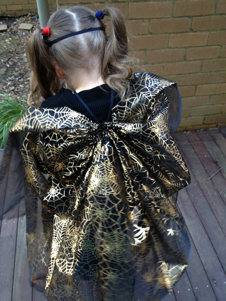 Anyway, I traipsed off to Spotlight to see what kind of spidery fabric I could find. Â Of course, there was the small problem of, ‘how do I make a tarantula outfit?,” and did I mention I only gave myself a day to get this finished? Â Ah, nothing like being the queen of last minute projects. Â I couldn’t believe my eyes when I saw the fabric with the golden spiderwebs. Â I kind of fashioned the fabric as wings, so it would stay on her back and not get in her way. Â I had a giggle imagining anything like this available it the overly pink girl’s section of toy stores!