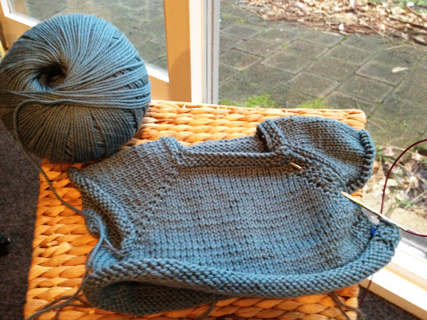 I have put aside my Beyond Puerperium from last week to finish for Jairah at a later date. Â I have cast on another in a smaller size. Â It does seem to be a pattern that runs on the large side. Â I know my gauge is right. Â I am knitting the 0-3 month size and it looks closer to 6 months, which should be fine for my friend’s baby, as I am aiming for it to fit for the coming European winter. Â I’m using Bendigo Woollen Mills luxury 8ply in Lake. Â It’s a lovely grey/blue and buttery soft.