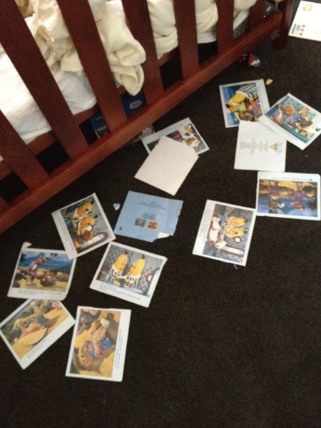 Jairah has taken a shine to books of late and I will often find him propped up on the sofa reading a book to himself, a priceless moment indeed. Â He has a book read to him every night and likes to take whichever book we have read to him, to bed. Â I thought this was so sweet, as you could hear him reading the book to himself (in the dark) after you left the room. Â This morning when I went into his room, I was greeted with what could only be described as a book massacre. Oh that poor book met its end in a big way. Â Suffice to say, Jairah will still be read to of a night, but I think for the time being, he is going to have to make up his own stories once it is lights out!