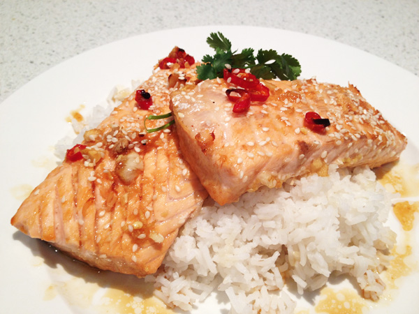 This is a tasty salmon dish filled with lots of Asian flavours. The salmon remains lovely and moist as you finish off the cooking in the oven. You can alter the heat of the dish by adding more chilli or if you prefer, you can omit the chilli altogether if you are not a fan.