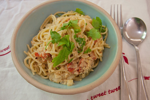 Fry off onion and garlic in oil. Â Add tuna, tomato, cream, chilli and salt. Â Simmer for approximately 5 minutes on medium heat. Â Stir in egg and mix quickly to evenly distribute throughout sauce. Â Turn off heat. Â Toss in cooked pasta and coat well with the sauce. Â Serve immediately garnished with chopped parsley.