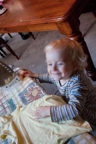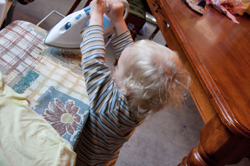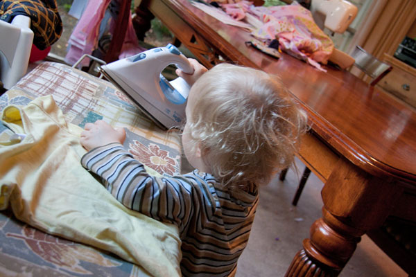 I was in the kitchen preparing a meal the other day and noticed that Jairah was being oh so quiet. Â I took a peak around the corner of the door to discover Jairah busily ironing (the iron was unplugged). Â I quickly grabbed the camera to get some photo evidence. Â He was very proud of his efforts. Â Especially when he discovered that water came out of the iron if you tipped it up. I honestly never knew ironing could be so much fun. Â Oh, and that scrunched up fabric in the background on the table (second photo down)? Â Well that was Scarlett’s birthday quilt all laid out nicely, ready for my next step towards finishing the top. Â Oh, hum, guess I shouldn’t complain with the help I was getting in the meantime.