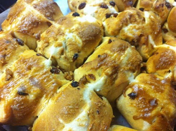 Scarlett helped me glaze them and she couldn’t get enough of the smell, (well they are so gorgeously spicy in fragrance). Â Of course lashings of butter were in order to top off our afternoon snack and a cup of tea for me to wash down my bun buns. Â Now the question is, do hot cross buns suffice as dinner?
