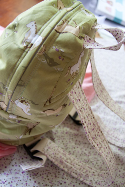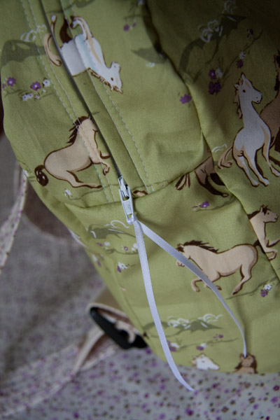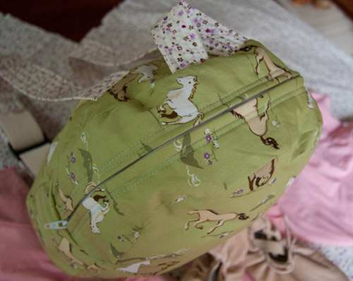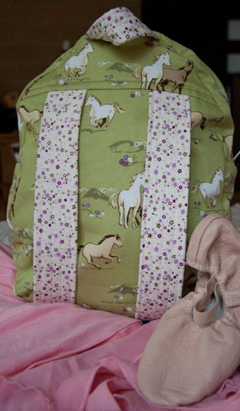 I have made my first project from the New Oliver + S, Little Things to Sew book. Â I made the backpack for my horse crazy girl, Scarlett. Â She has been desperate for a new bag and I didn’t want to buy another made in China, fall-apart-the-next-day bag. Â It will serve as her ballet bag and perhaps for sleepovers too.
