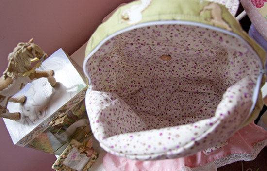 I found the pattern easy to follow and there was no swearing or throwing of sewing items (oh I have been quite the diva in my sewing past!). Â Everything lined up and it sewed up beautifully. Â Of course, I couldn’t get a heavy duty zip, so had to buy a dress zip. Â I’m just hoping the zip will last. Â I used webbing for the straps and covered them in the flower material and I double sewed around the main body of the bag and lining, as our dear Scarlett lives life with exuberance and thus, so do her belongings.