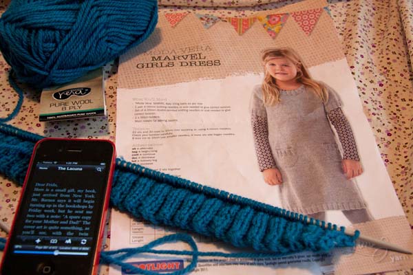 I cast on a new project this week. Â I decided to go ahead and make Scarlett a dress from a pattern I shared in a previous yarn along. Â At the time I’d purchased acrylic yarn suggested in the pattern and as much as I loved the colour, I didn’t like the feel of the acrylic yarn. Â I purchased some yarn this week that was 100% wool and only $3 a ball. Â It’s a very similar colour to what I was going to use. Â I was also able to return the acrylic yarn that I had originally purchased. Â The yarn appears quite blue in my photo, but I would describe it as more like teal (not great light here today for photos).